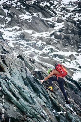 Side view of alpinist with backpack using rope while climbing alpine ridge. Male climber ascending mountain cliff, trying to reach mountaintop. Concept of mountaineering, alpinism and alpine climbing.