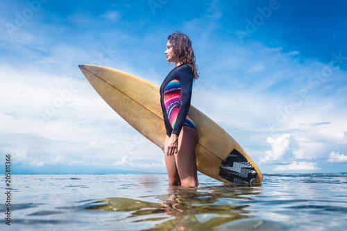 side view of attractive sportswoman in wetsuit with surfing board standing in ocean at Nusa dua Beach, Bali, Indonesia