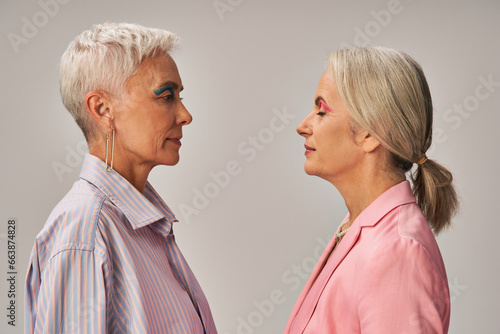 side view of fashionable senior ladies in blue and pink attire standing on grey, vanity fair concept