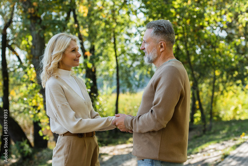 side view of happy mature couple holding hands and looking at each other in green park.