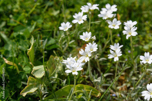 Side view of large group of white flowers of evergreen perennial Cerastium tomentosum plant in a sunny spring garden, beautiful outdoor floral background