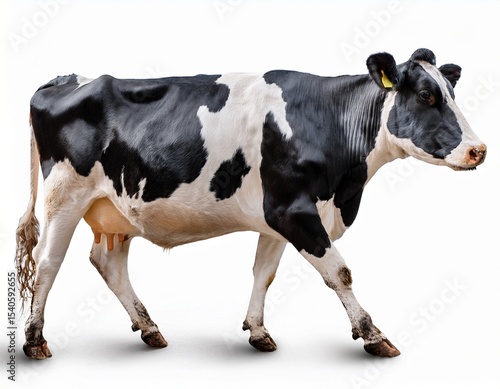 side view of tagged holstein dairy cow walking on white background livestock identification modern agriculture and commercial dairy farming concept
