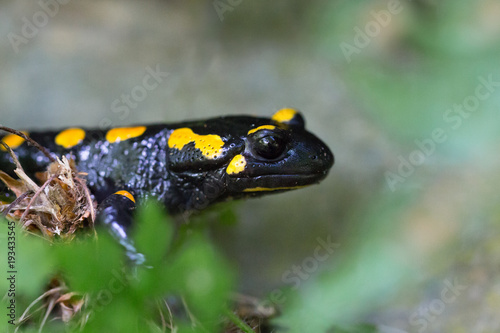 side view portrait spotted fire salamander (salamandra salamandra)