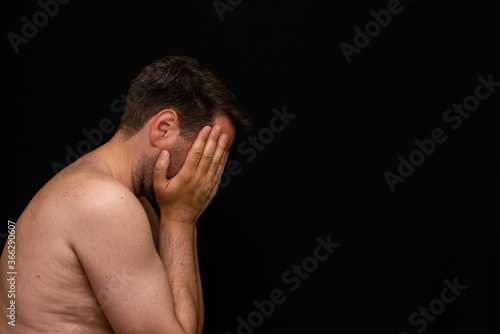 Side view sad thoughtful undressed handsome male covering the head with palms demonstrating reverie.