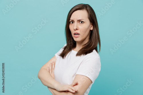 Side view young indignant caucasian woman 20s she wear white t-shirt hold hands crossed folded look camera isolated on plain pastel light blue cyan background studio portrait People lifestyle concept