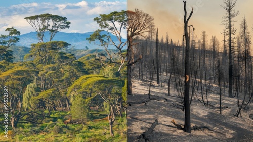 Side-by-side imagery contrasting a lush green forest and a forest devastated by wildfire.