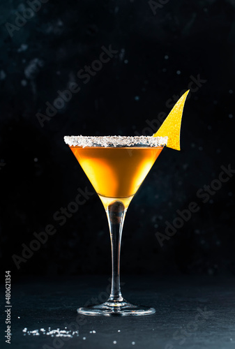 Sidecar cocktail with cognac, liqueur, lemon juice and ice. Black background, copy space