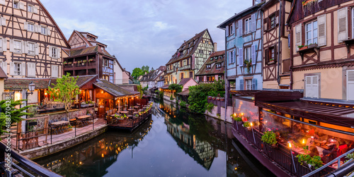 Sightseeing of France. Amazing colorful traditional half timbered houses in Colmar old town, beautiful night view, Colmar, Alsace, France