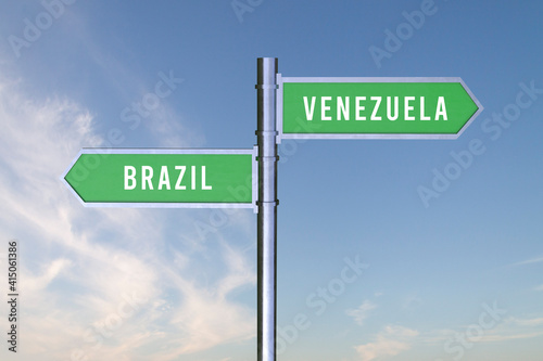 Sign indicating the direction of the borders between two countries BRAZIL,VENEZUELA, 3d render.