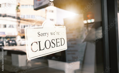 Sign text hangs on the entrance door of the shop, restaurant, cafe. That reads "Sorry, we're closed". Closed due to financial difficulties and economic crisis.