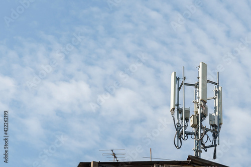 Signal tower of telecommunication on roof with blue sky background. Signal tower of 4g, 5g for a mobile network. Copy space.