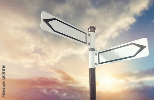signpost, road, signs, arrow, banner, black, blank, blue skies, board, choice, choose, concept, conceptual, copy space, crossroad, destination, directing, directional, empty, found, go, guidance, guide, guidepost, horizontal, indicator, inform, information, location, lost, metal