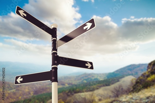signpost, road, signs, arrow, banner, black, blank, blue skies, board, choice, choose, concept, conceptual, copy space, crossroad, destination, directing, directional, empty, found, go, guidance, guide, guidepost, horizontal, indicator, inform, information, location, lost, metal