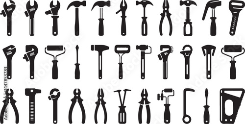 Silhouette Collection of Various Hand Tools Including Wrenches, Hammers, Pliers, and Screwdrivers, Ideal for DIY and Construction