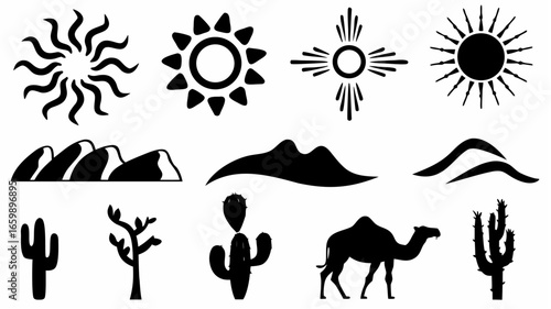 Silhouette desert landscape featuring sun variations mountains and cacti with a camel illustration set