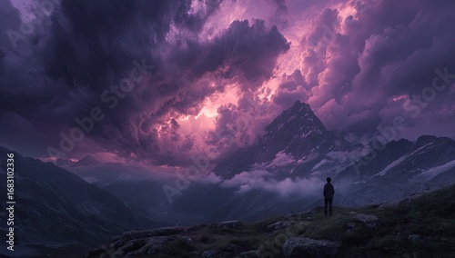 Silhouette figure gazes at vibrant storm clouds over alpine peaks