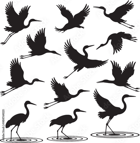 Silhouette illustration of flying and standing cranes elegant bird collection