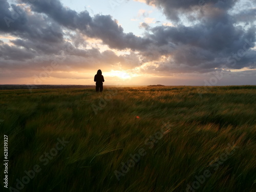 Silhouette in the sunset on field