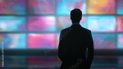 Silhouette of a Businessman Contemplating a Wall of Colorful Screens