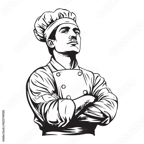 Silhouette of a chef with a chefs hat and clothing. Illustration in black