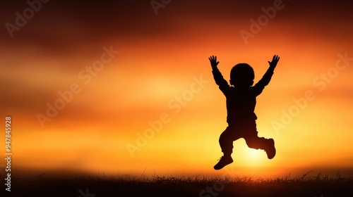 Silhouette of a child jumping with a sunset in the background, creating an elegant and vivid glow, minimal and distinct focus