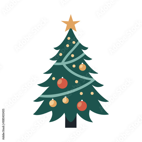 Silhouette of a Christmas tree with branches adorned with ornaments and a shining star on top.