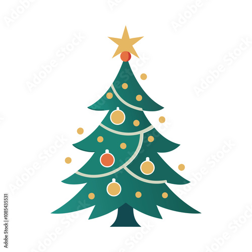 Silhouette of a Christmas tree with branches adorned with ornaments and a shining star on top.