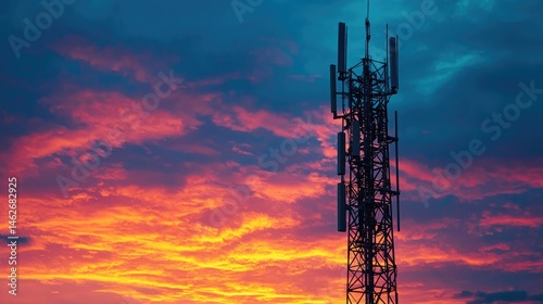 Silhouette of a communication tower against a vibrant sunset sky.