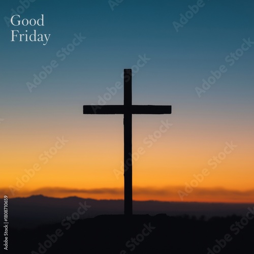 Silhouette of a cross against a vibrant sunset sky with the words good friday