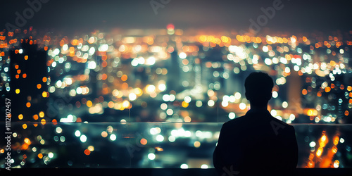 Silhouette of a man overlooking a brightly illuminated cityscape at night, with vibrant bokeh lights and ample copy space