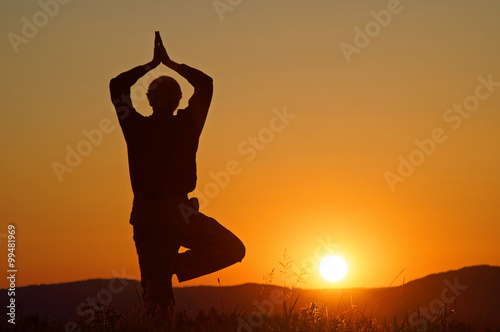 Silhouette of a man practicing yoga in a position Vrikshasana on a grassy horizon at sunset.