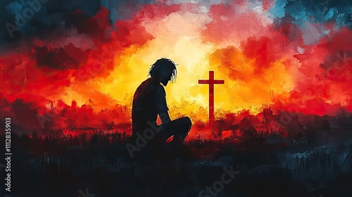 silhouette of a man praying in front of a cross digital watercolor painting