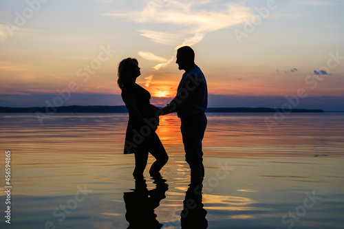 Silhouette of a married couple stands in the water of the lake against the background of sunset. The family is expecting a baby.