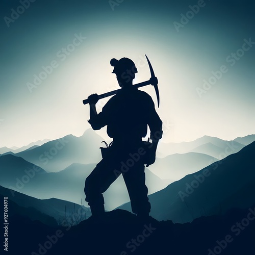 Silhouette of a miner holding a pickaxe, with a mountain in the background.