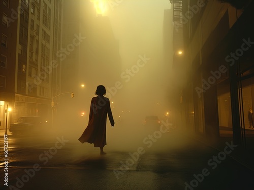 Silhouette of a mysterious person walking on a foggy, dimly lit street at night. Great for stories about crime, suspense, horror, loneliness, mystery, horror and more.