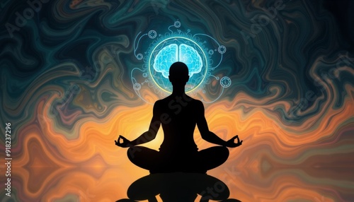 silhouette of a person meditating with a glowing brain surrounded by swirling colors and patterns conveying the tranquility and complexity of inner thoughts and subconscious e