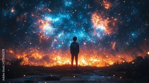 Silhouette of a person standing before a cosmic explosion of blue and orange stars in a night sky Astrology Day
