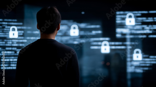 Silhouette of a person standing in front of cascading lines of code and glowing padlocks projected on a dark wall, symbolizing online security concept, hacker defense, encryption, and the unseen