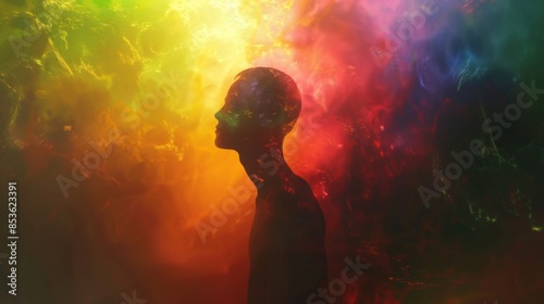 Silhouette of a person surrounded by abstract swirls of yellow and green light