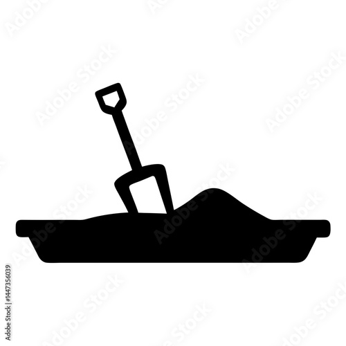 Silhouette of a shovel in a sandbox filled with sand or dirt