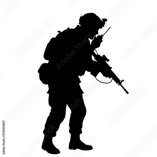 Silhouette of a soldier in tactical gear holding a rifle and using a radio