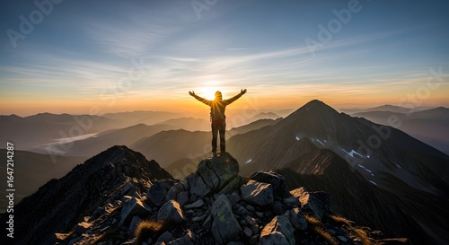 Silhouette of a triumphant person standing on a rocky mountain peak with arms raised at sunset