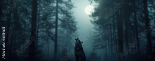Silhouette of a wolf howling in a foggy forest under a full moon, creating an eerie and mysterious nighttime atmosphere.