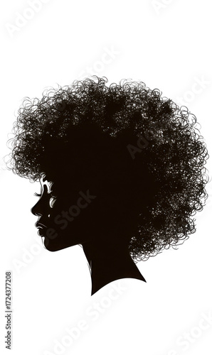 Silhouette of a woman with afro hairstyle, side view, black and white illustration.