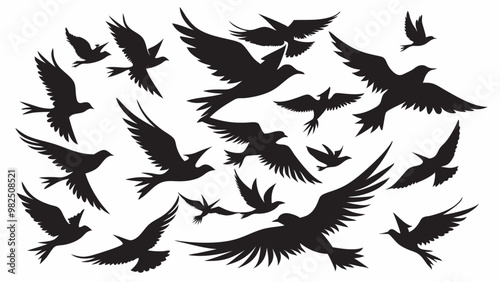 Silhouette of birds in flight on white background, different sizes and directions convey movement.