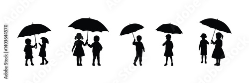 Silhouette of Children Under Umbrella - Artistic Black Outline.