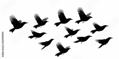 Silhouette of Flock of Birds Soaring Gracefully Against a White Background.