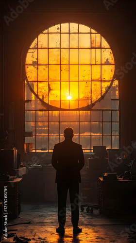 Silhouette Of Man Looking At Sunset Through Pixelated Window