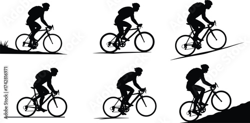 Silhouette of man riding bicycle on different terrains, cycling uphill and downhill, outdoor fitness sport, mountain biking adventure illustration