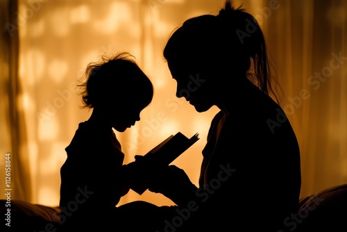 Silhouette of Mother and Child Reading Together in Warm Ambient Light
